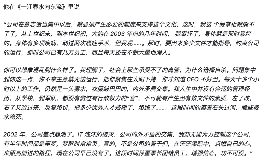 任正非在2008年的讲话《人生是美好的,但过程确实是痛苦》的中说到:“近期有些员工自杀,我心里是很沉重的,也很理解他们,因为从99年到2007年,其实我个人就有多次感觉活不下去的经历,我跟他们是同类,所以我才有这么多感触。”那时,华为面临的经营压力和挑战,但通过坚持和调整企业战略度过了难关。